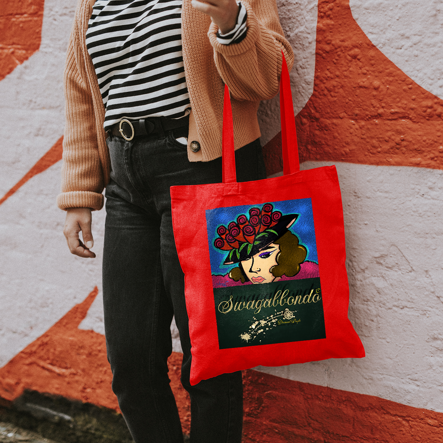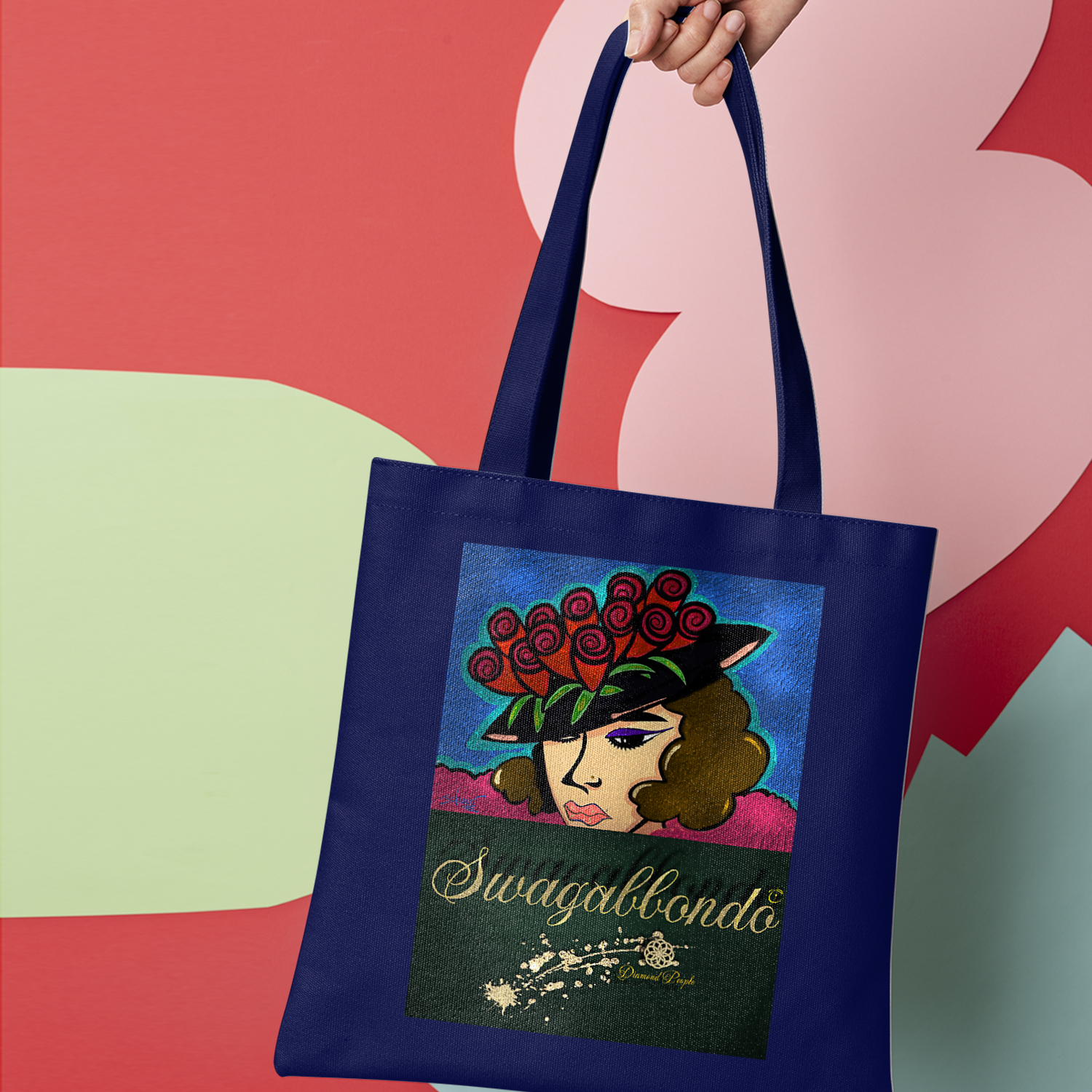 Borsa in cotone con manici lunghi di dimensione 38x42 cm circa.
